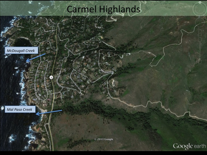 McKenna’s project measured copper in two creeks flowing into the ocean from the Carmel Highlands. The locations of these creeks are shown on the map in Figure 1. McDougall Creek is a small stream running through the middle of the Highlands community. Mal Paso Creek begins in the mountains and flows along the community’s southern edge. This watershed has few roads and homes compared to McDougall Creek.