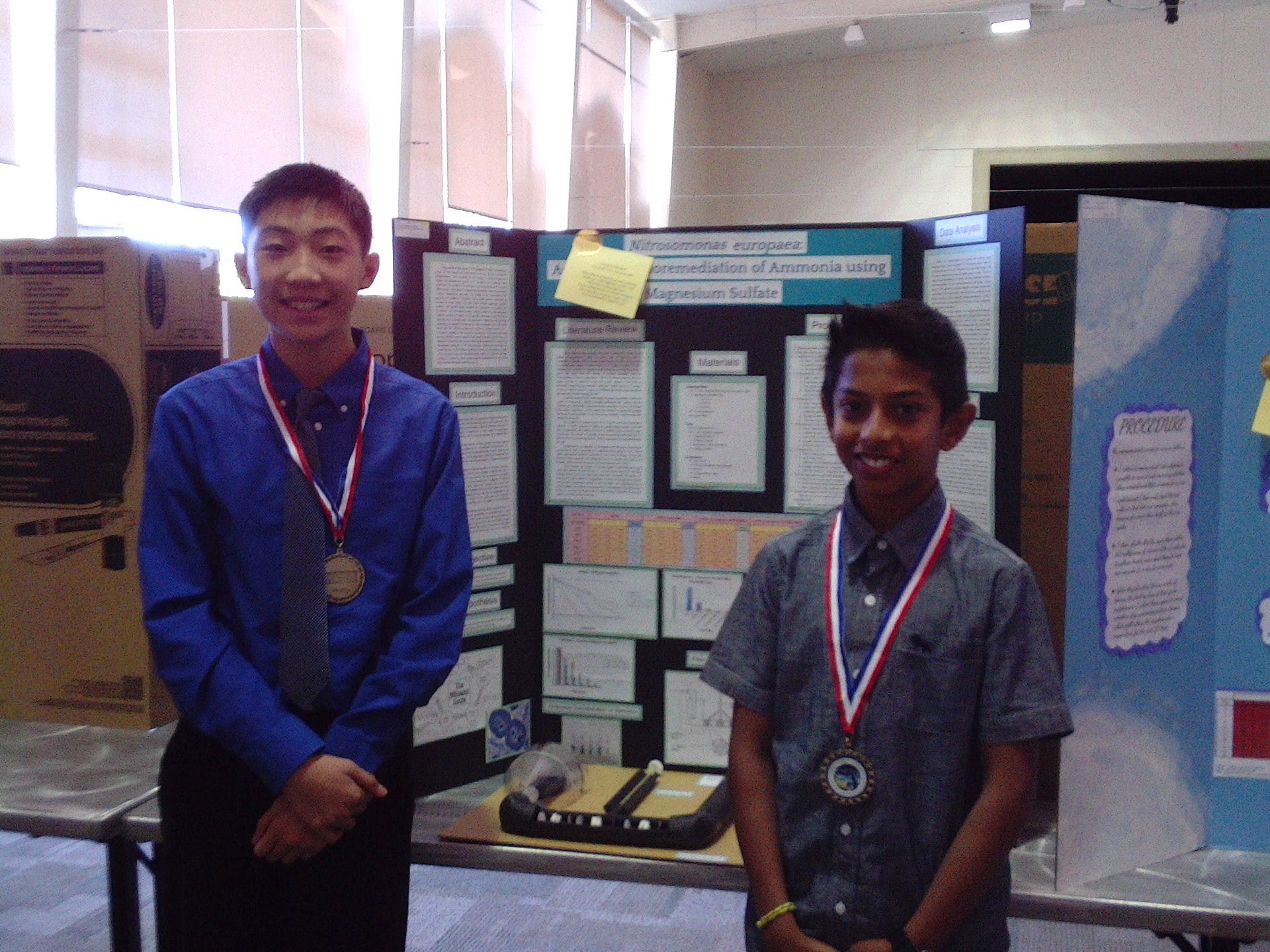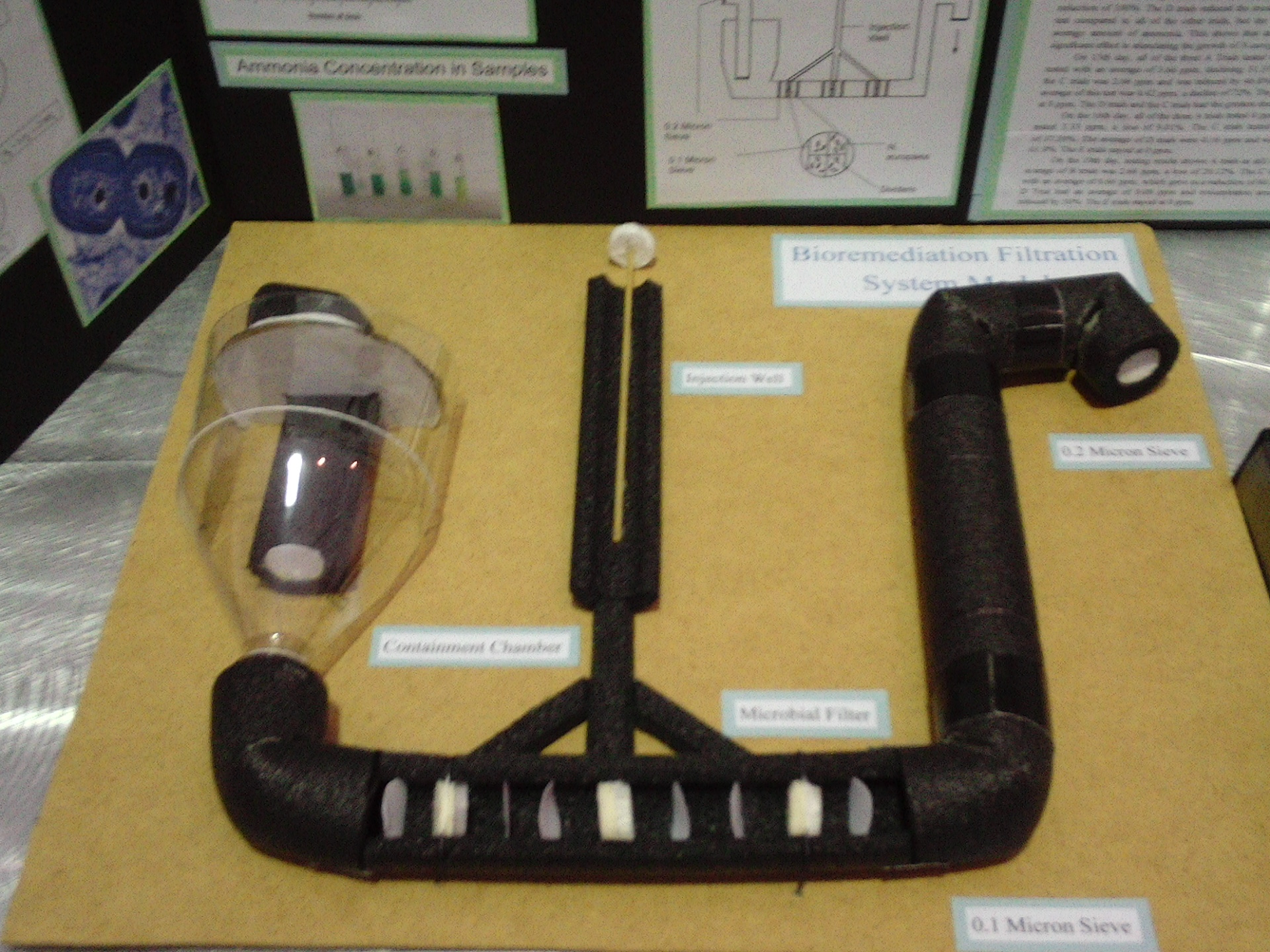 What Christopher and Rohan did was to show how addition of magnesium sulfate (also found in Epson Salts) enabled Nitrosomonas to increase the rate of ammonia oxidation. Next, they cleverly designed a filtration system containing this microbe (see photo at right) that successfully removed ammonia from contaminated water. They then suggested that a scaled-up version of this filter might one day clean up excess ammonia in the Salinas River. Science fair judges love it when students consider the bigger picture. As a result, this junior-level project also won first prize in Microbiology.